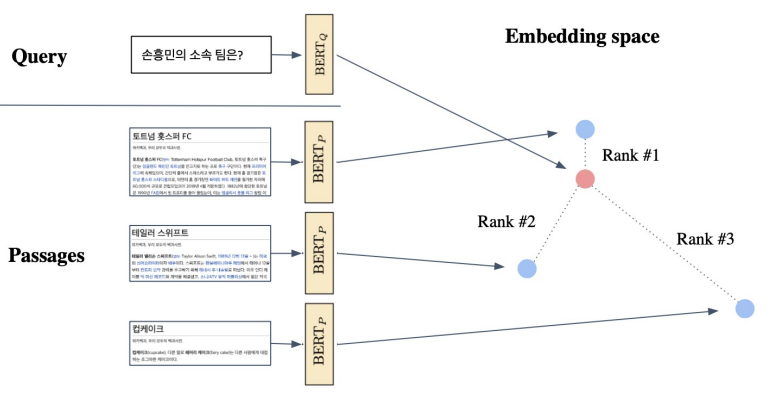 Inference: Passage와 query를 각각 embedding한 후, query로부터 가까운 순서대로 passage의 순위를 매김