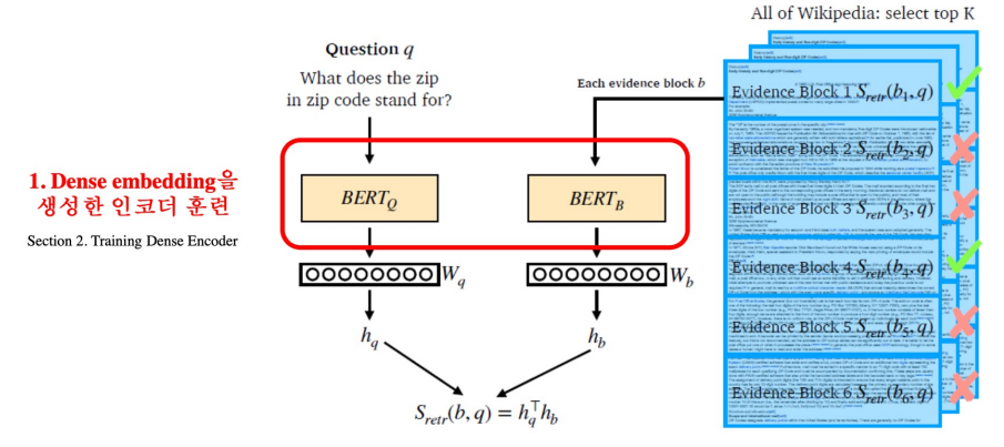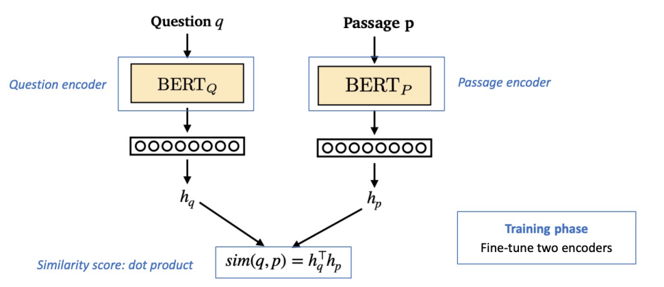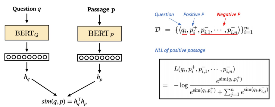 학습목표: 연관된 quention과 passage dense embedding 간의 거리를 좁히는 것 (또는 inner product를 높이는 것). 즉 higher similarity.