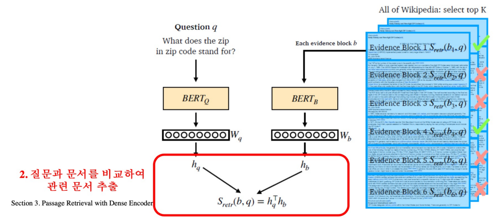 1) 연관된 question과 passage간의 dense embedding 거리를 좁히는 것 (higher similarity) => Positive