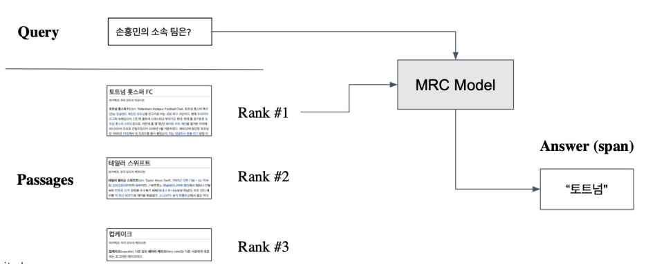 Retriever를 통해 찾아낸 Passage를 활용, MRC (Machine Reading Comprehension) 모델로 답을 찾음.