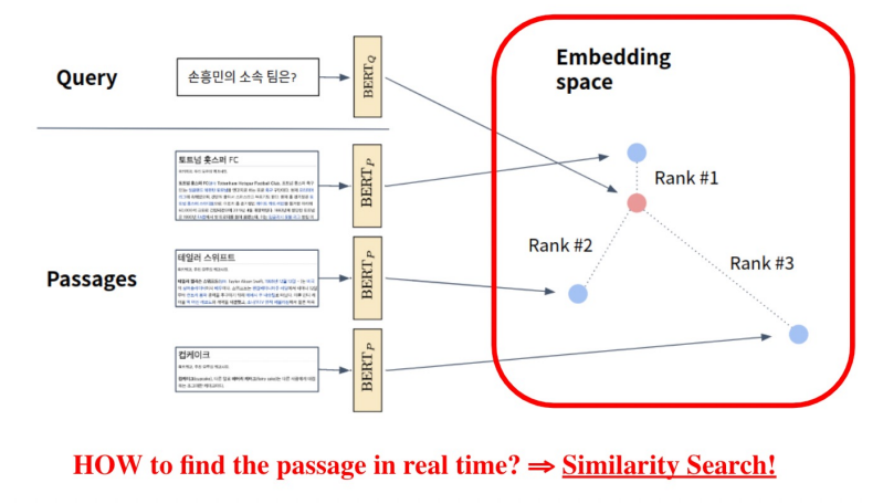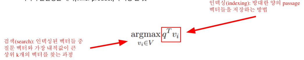 주어진 질문(query) 벡터 q에 대해 Passage 벡터 v 들 중 가장 질문과 관련된 벡터를 찾아야 함