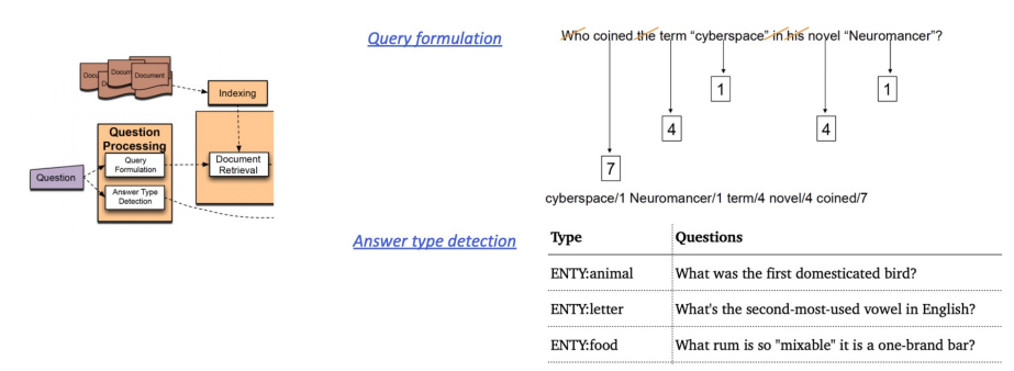 Query formulation: 질문으로부터 키워드를 선택 / Answer type selection (ex. LOCATION: