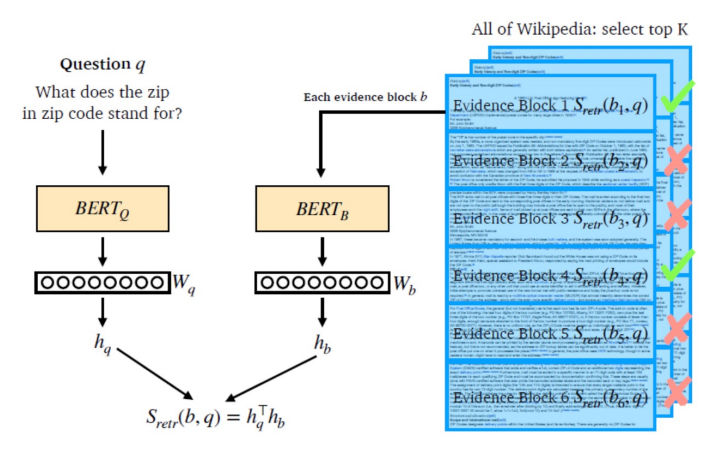 2) Passage retrieval: 기존의 IR 방법을 활용해서 연관된 document를 뽑고, passage 단위로 자른