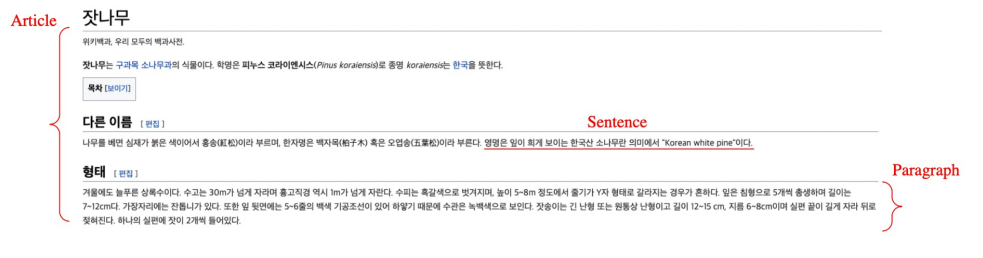 위키피디아에서 각 Passage의 단위를 문서, 단락, 또는 문장으로 정의할지 정해야 함.