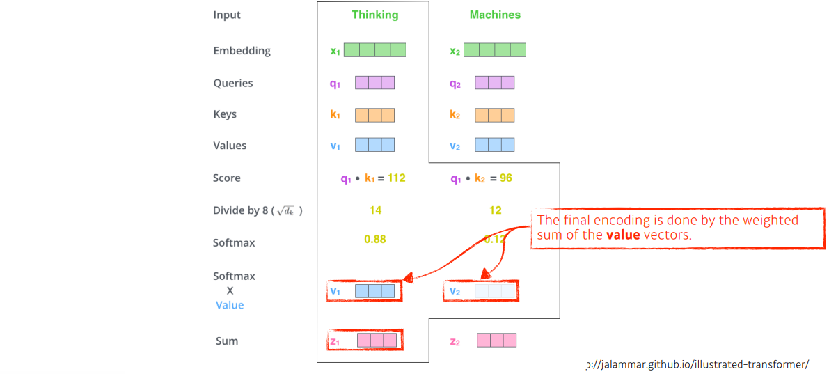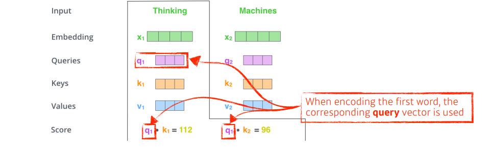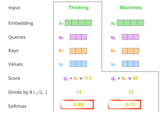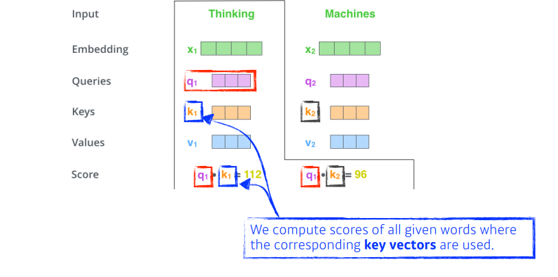 'Thinking'의 쿼리벡터와 각 단어의 key벡터를 이용하여 각각 score를 구한다.