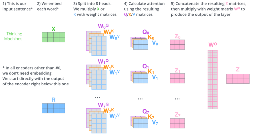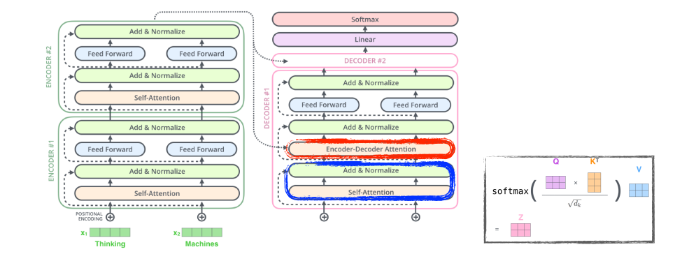 encoder=decoder attention layer에서는 multi-headed self-attention처럼 동작하지만 아래 레이어에서 Query 행렬을 생성하고 key와 value를 인코더 스택에서 가져온다.