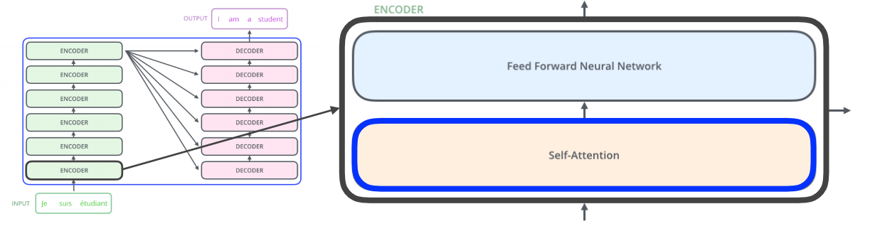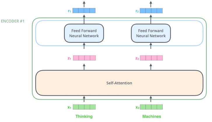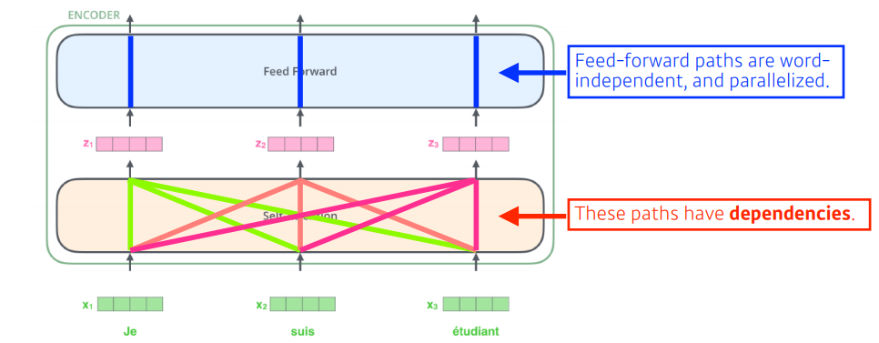 다음으로, 트랜스포머는 Self-Attention을 통해 각각의 단어들을 feature 벡터로 인코딩한다. 이 과정에서 각 벡터들은 모든 단어를 같이 고려한다. (dependency)