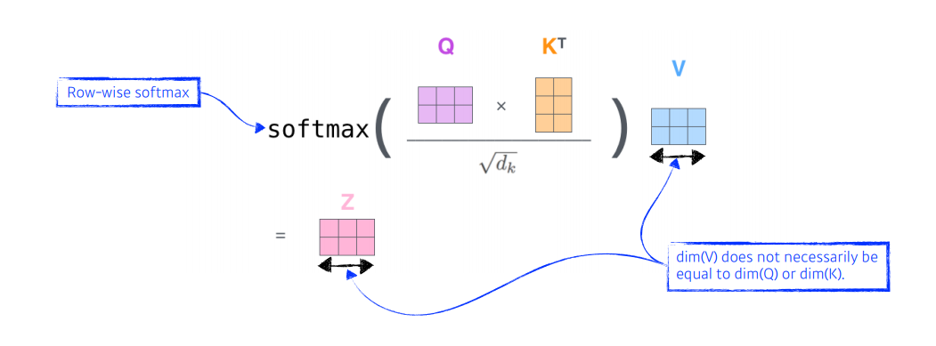 참고로, 위와 같이 Query와 Key는 내적을 해야되기 때문에 차원이 같아야 하지만, Value는 달라도 된다. 그리고 최종 차원은 Value의 차원이 된다.