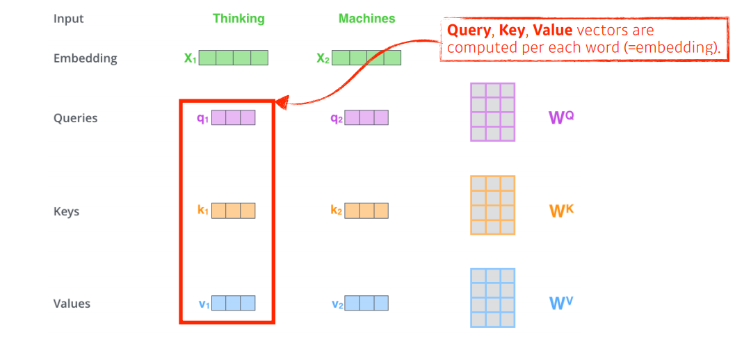 각각의 단어마다 Query, Key, Value벡터를 계산한다.