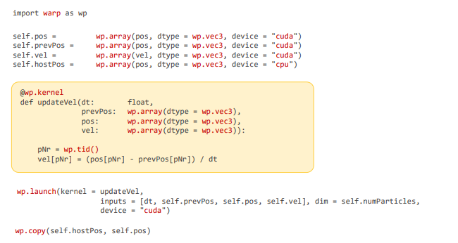 wp.launch() → 커널 이름, 입력 버퍼, 스레드의 수, 실행할 장치 지정