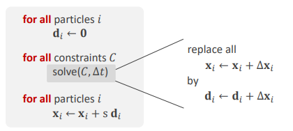 - 일반적인 solver(Gauss-Seidel 방식)는 제약 조건을 해결하면서 입자 위치를 즉시 업데이트함.