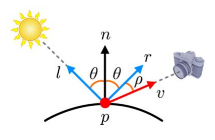 reflection vector (r) : 빛이 들어와서 반사되는 방향의 벡터