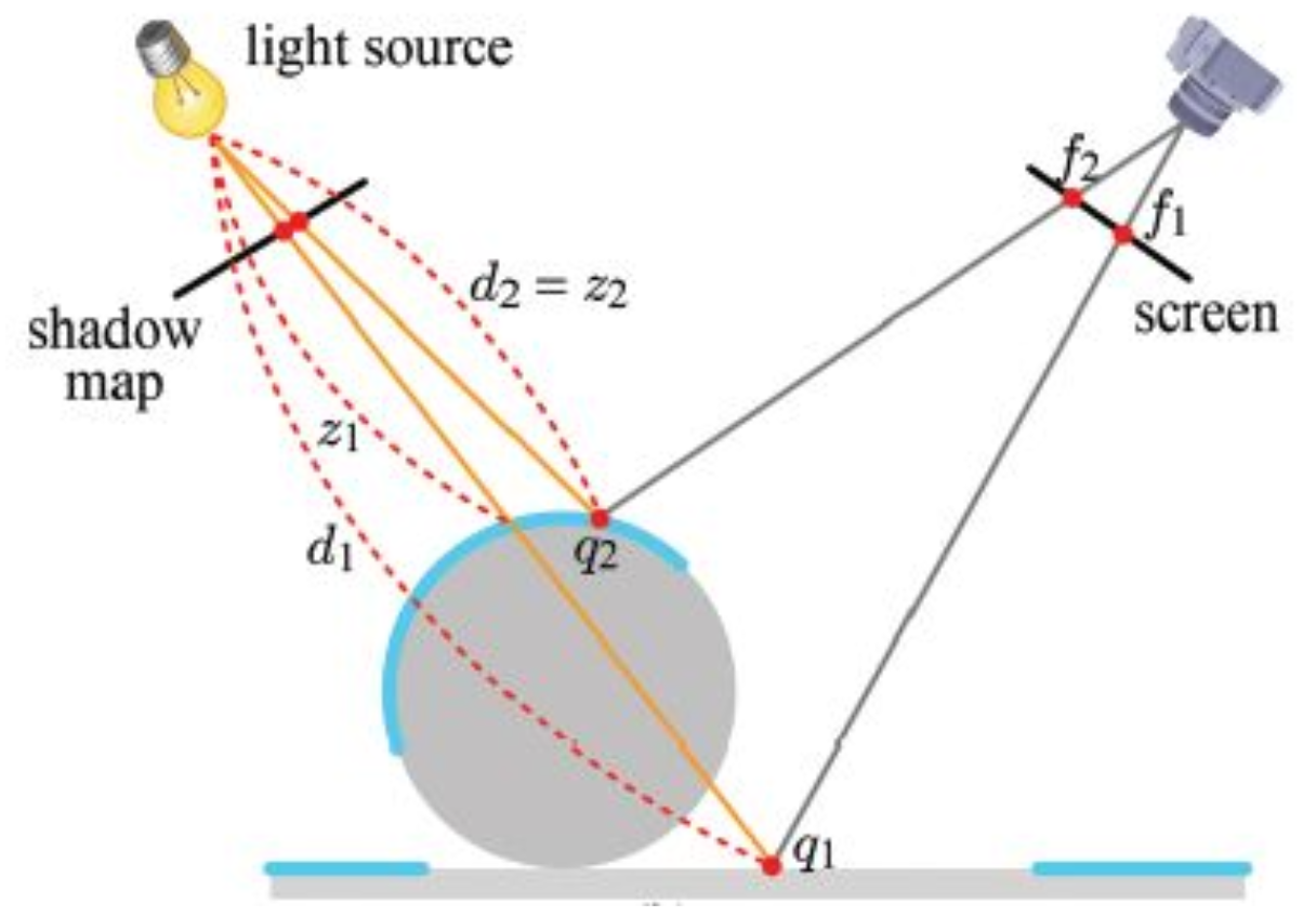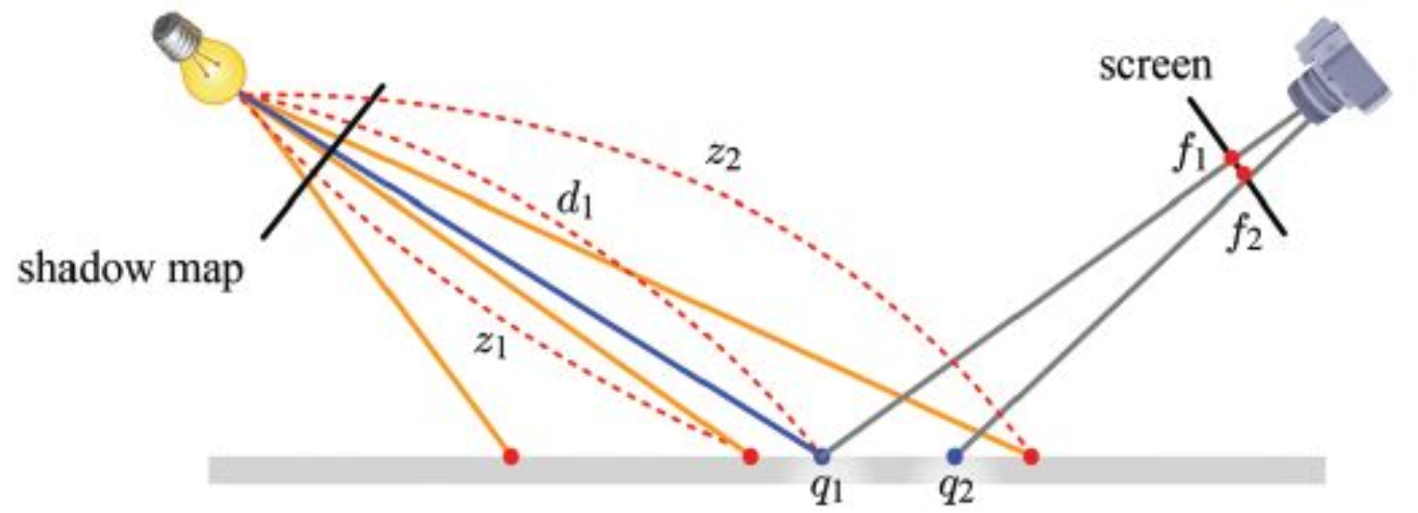 Depth Map은 이산적인 텍셀 단위로 깊이 값을 저장하기에 실제 렌더링 과정에서는 연속적인 표면 위의 한 점에 대한 깊이 값을 비교하기에 문제 발생 가능