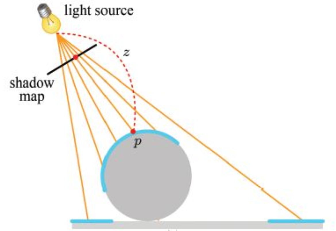 Pass 1 에서 만든 그림자 맵에 저장된 깊이 값(z) 과 비교