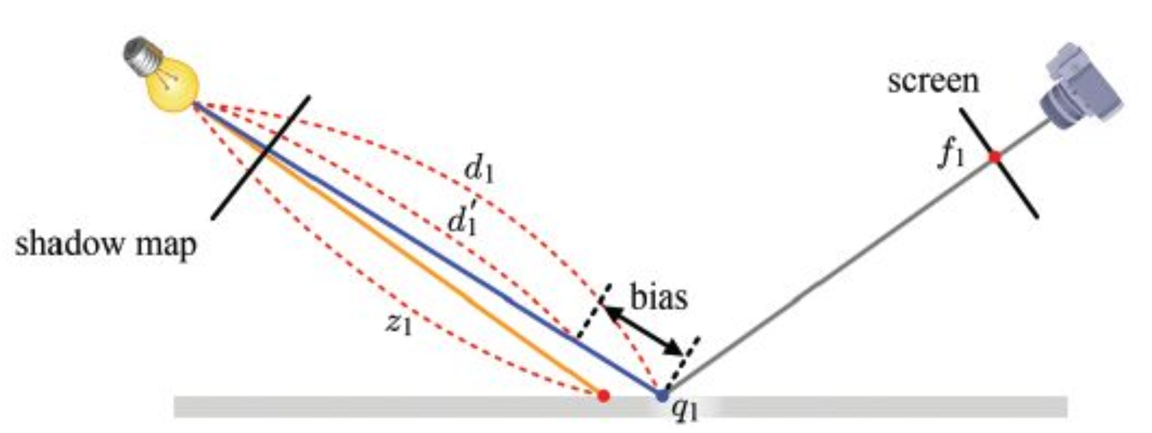 두 번째 패스에서 광원까지의 거리를 계산할 때, 아주 작은 값(바이어스)를 빼주어 d 값을 낮춤
