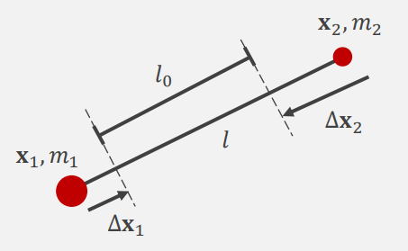 Δx1=W1+W2W1(l−l0)∣x2−x1∣x2−x1 , Δx2=−W1+W2W2(l−l0)∣x2−x1∣x2−x1(Wi=1/mi)