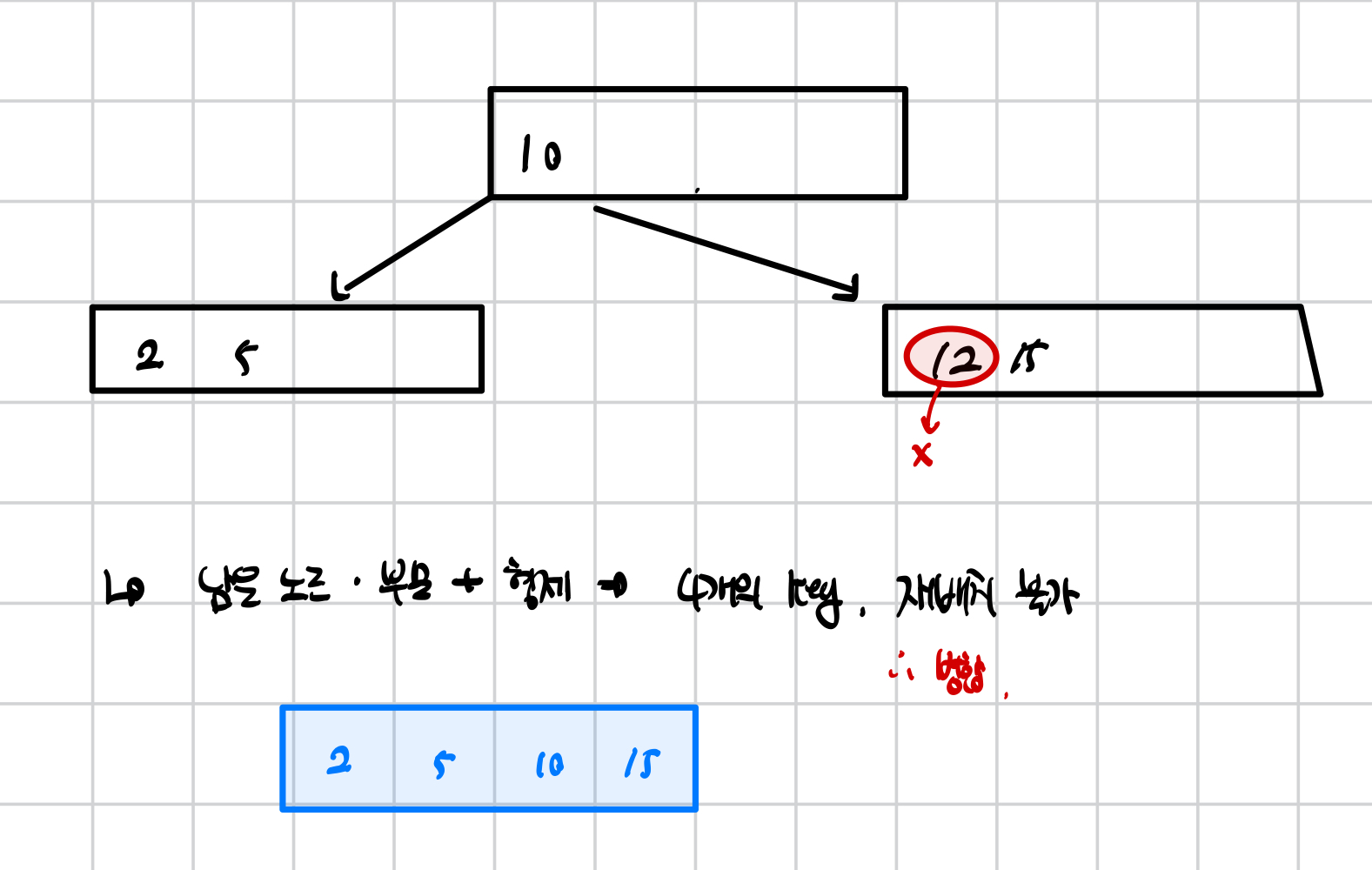 12를 지우게 되면 해당 노드에 9라는 키 하나만 남기때문에 최소 키 개수인 2개보다 작아지게 된다.