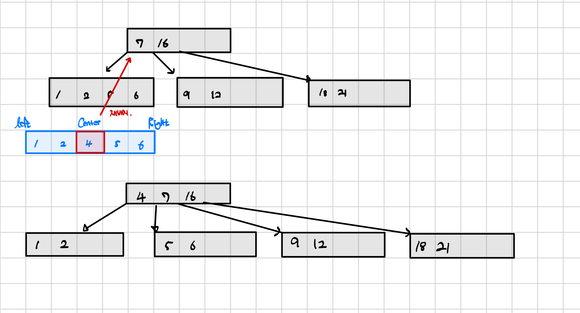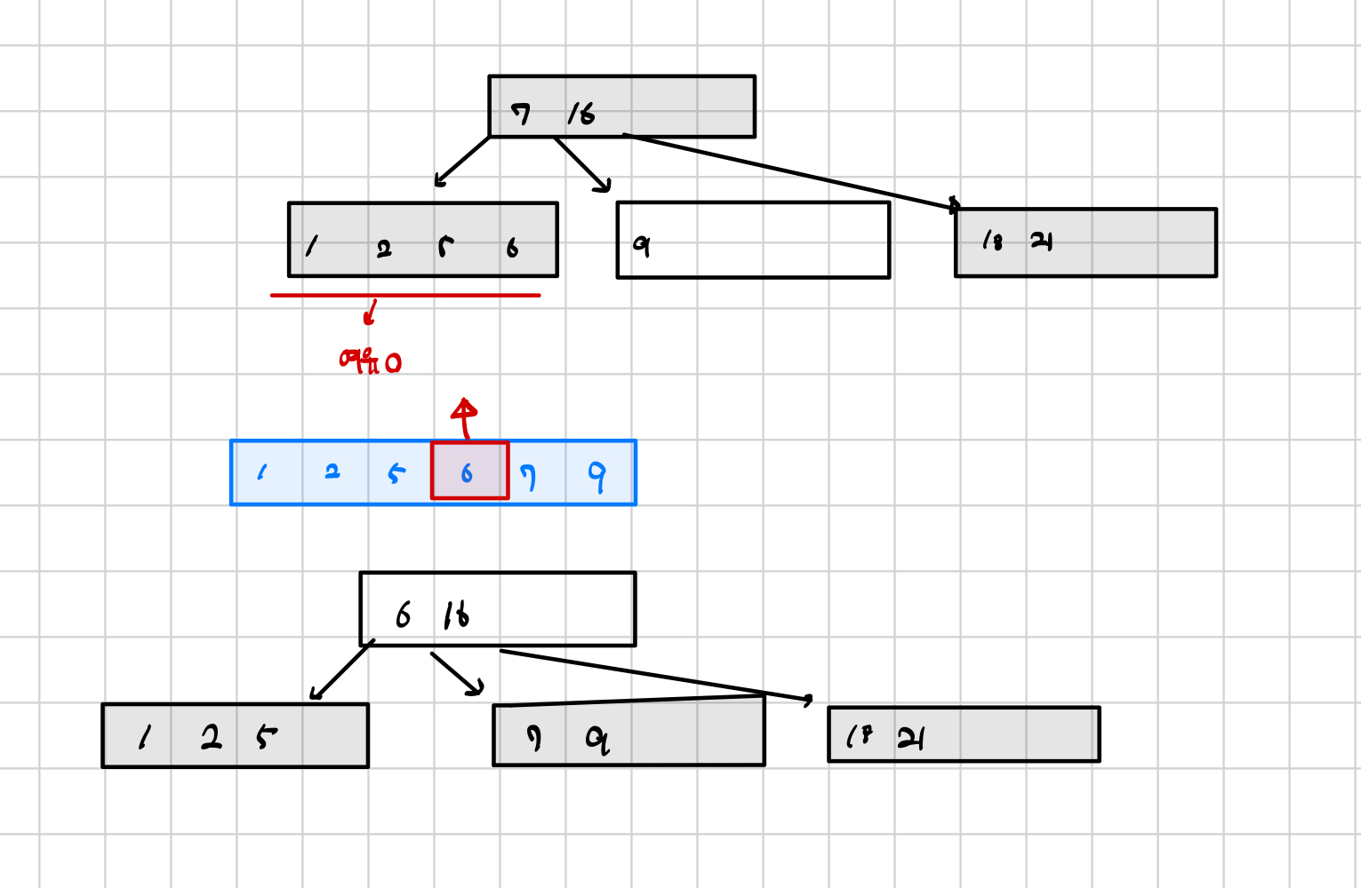 즉 남은 노드 + 부모의 중간 노드 + 형재 노드를 한 노드에 넣고 가운데를 기준으로 두 부분으로 나누어 재배치