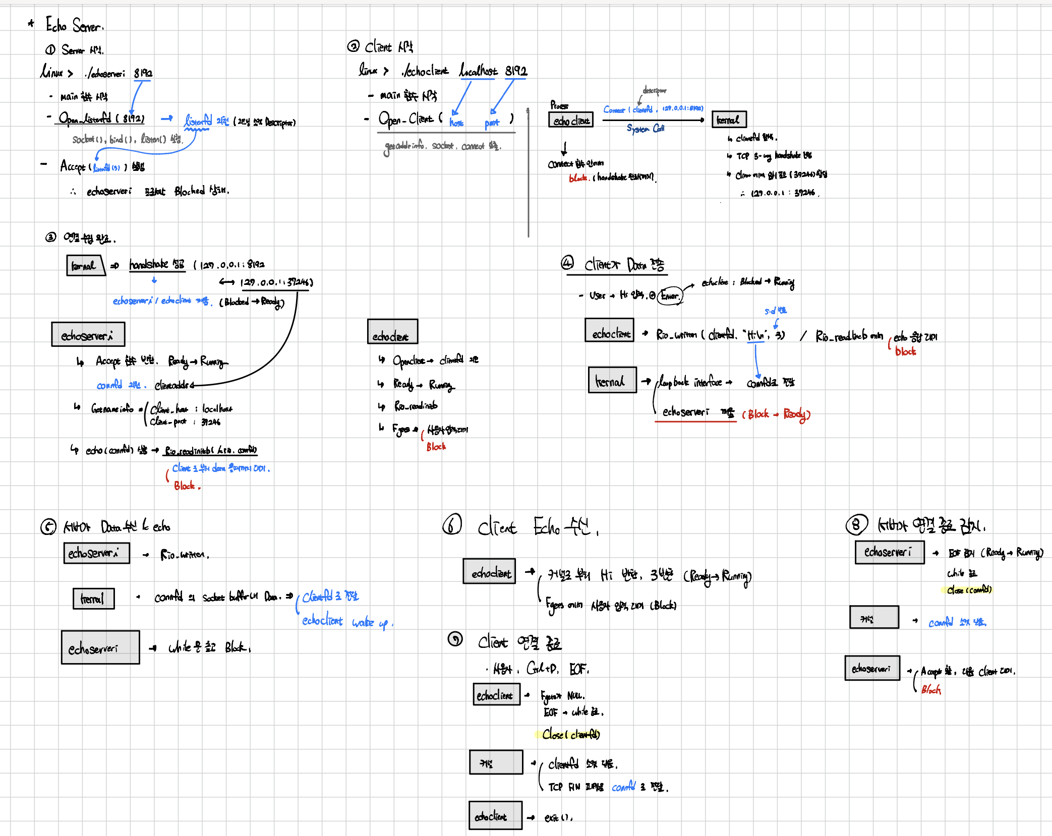 open_clientfd(host, port) 호출하여 서버에 연결하고 clientfd 얻기.Fgets).clientfd를 통해 서버로 전송 (Rio_writen).clientfd로부터 서버의 응답(에코) 읽기 (Rio_readlineb).Fputs).Close(clientfd) 호출하여 연결 닫기.서버 (주요 로직):