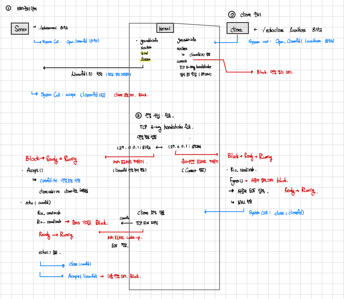 - 상태: **BLOCKED** (clientfd에서 서버 에코 응답 대기)