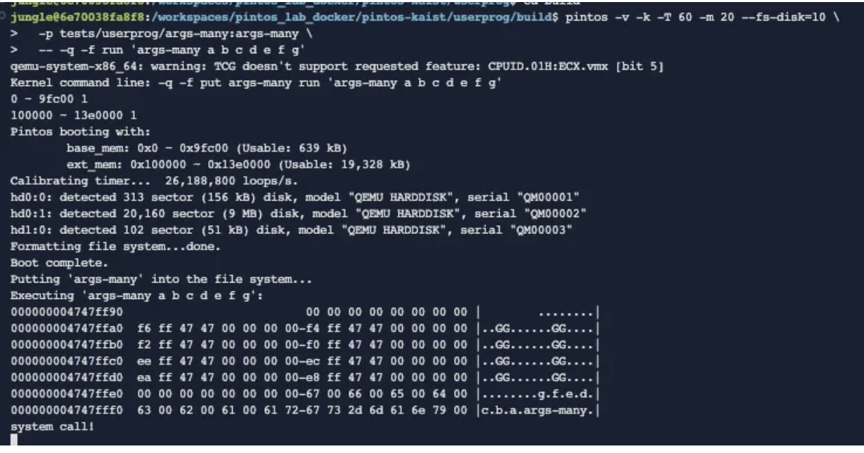 이렇게 잘 들어갔음에도 저기 argv 프린트가 안나와서 테스트 통과를 못하고 있다...