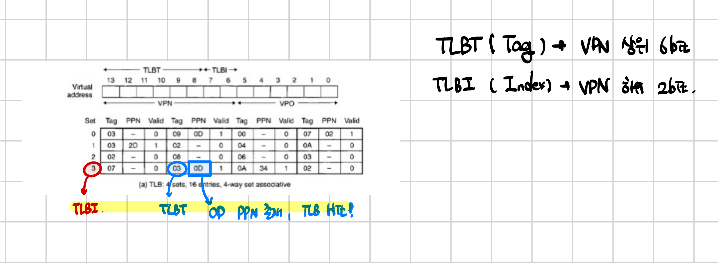 VPN는 또 TLB Tag(왼쪽부터 6비트), TLB Index(하위 2비트)로 분리 가능하다