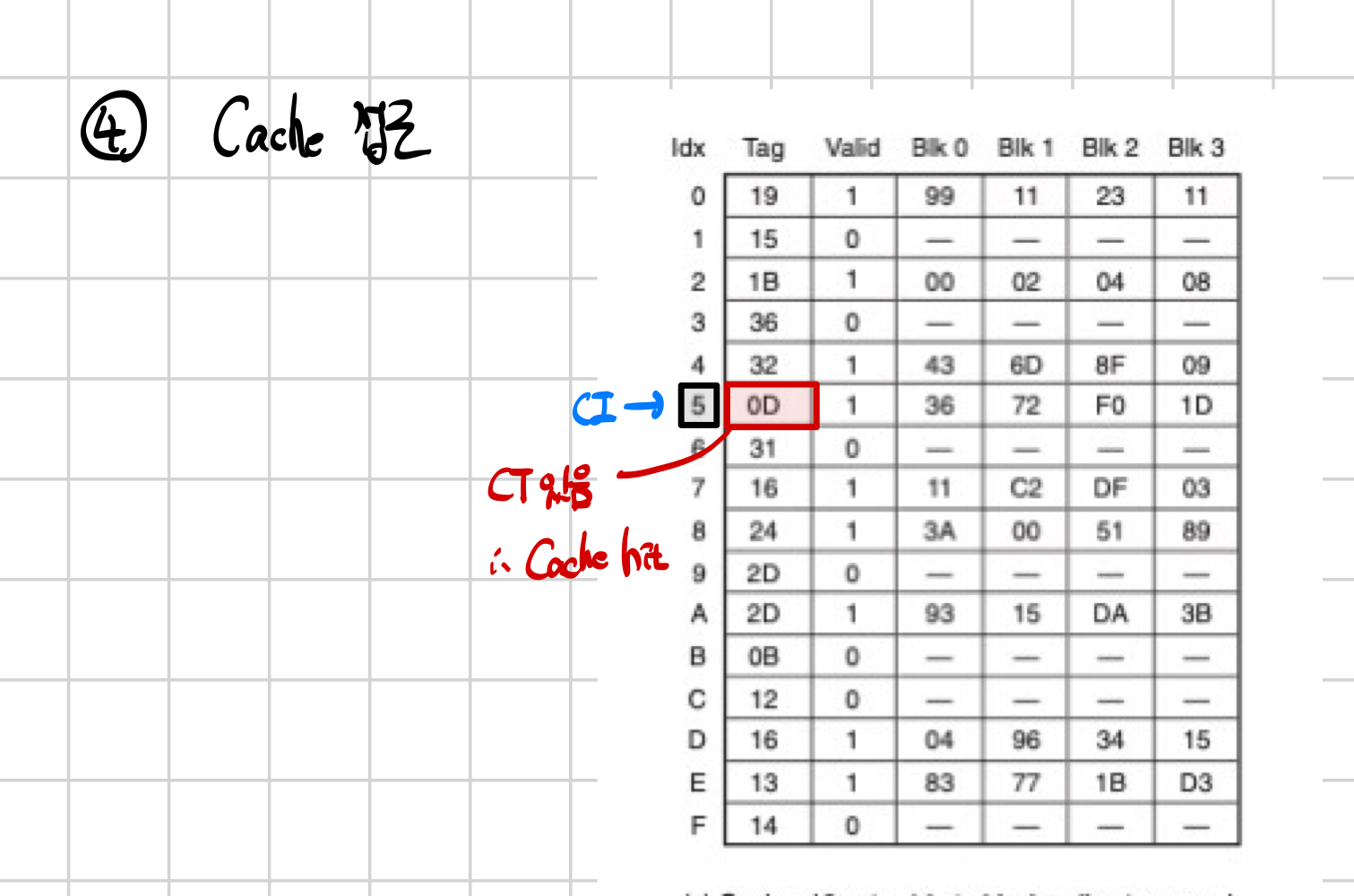 CT(Tag) : 0011 01 (0x0D)CI(Index) : 01 01 (0x05)CO(Offset) : 00 (0x00)TLB 와 동일한 방식으로 찾는다.