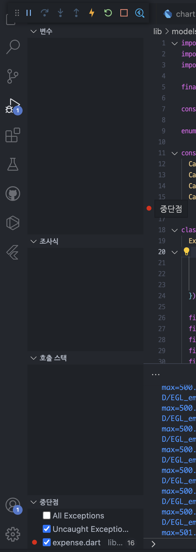 VSC 상에서 코드 줄 번호 옆에 클릭을 통해 설정할 수 있으며, 디버그 모드 최 하단에 종단점