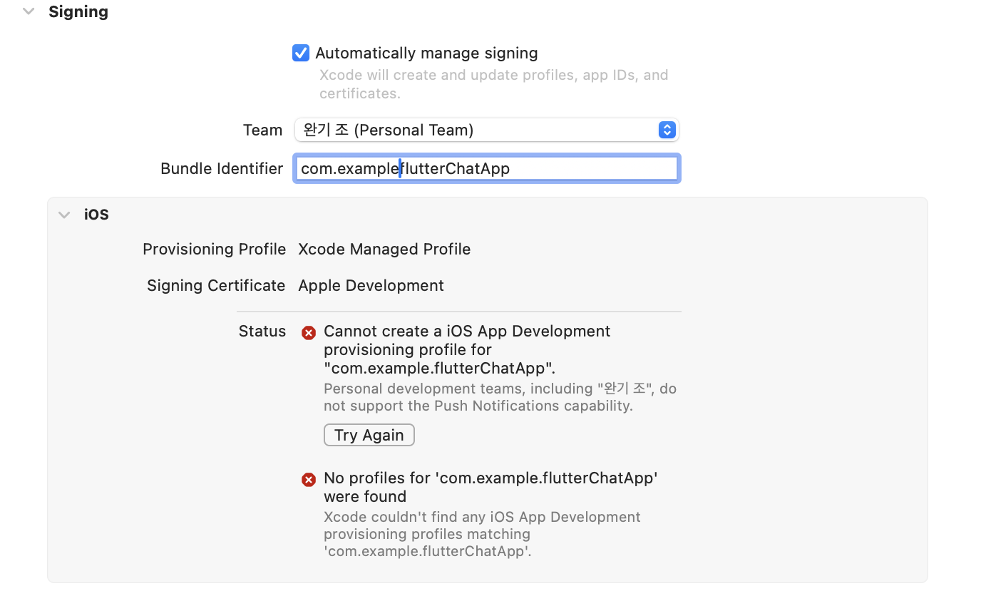 MacOS 라서 xcode에서 애플 디벨로퍼 계정을 활용하여 인증을 받아야하는데 이게 Personal Team이라 그런지