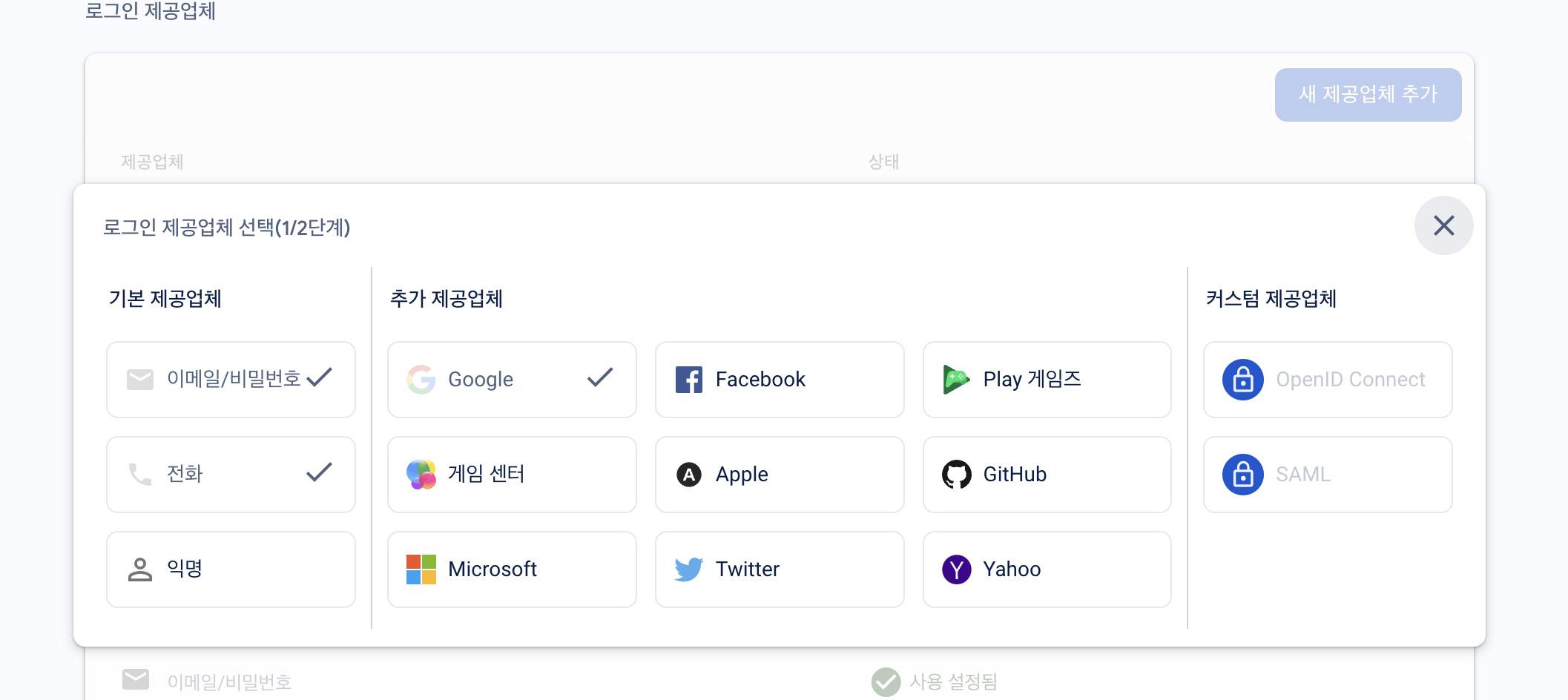 여기 로그인 제공업체에서 어떤 방식으로 인증을 받을지 설정하시면 됩니다.