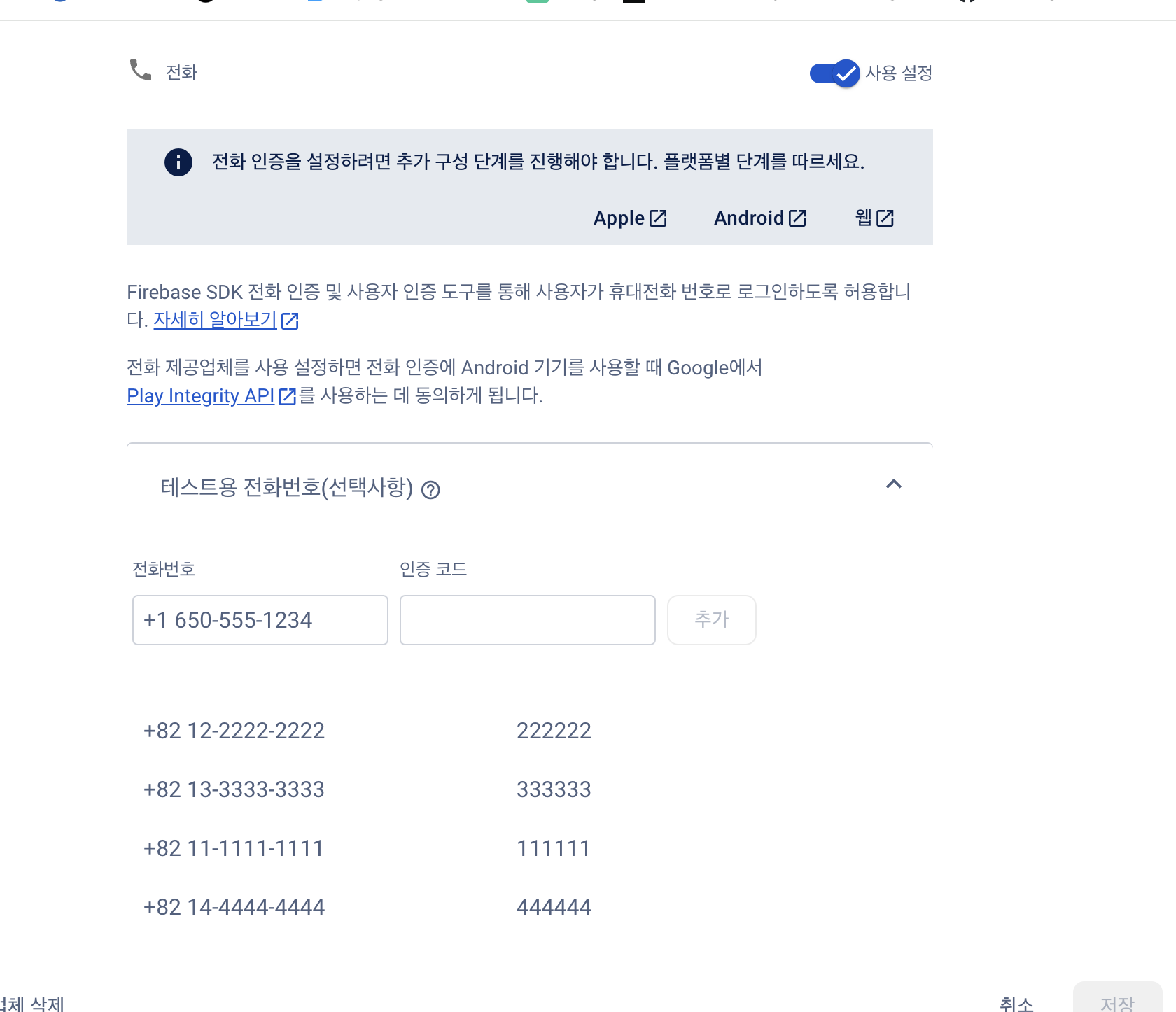 이렇게 테스트 전화번호를 설정하실 수 있습니다.