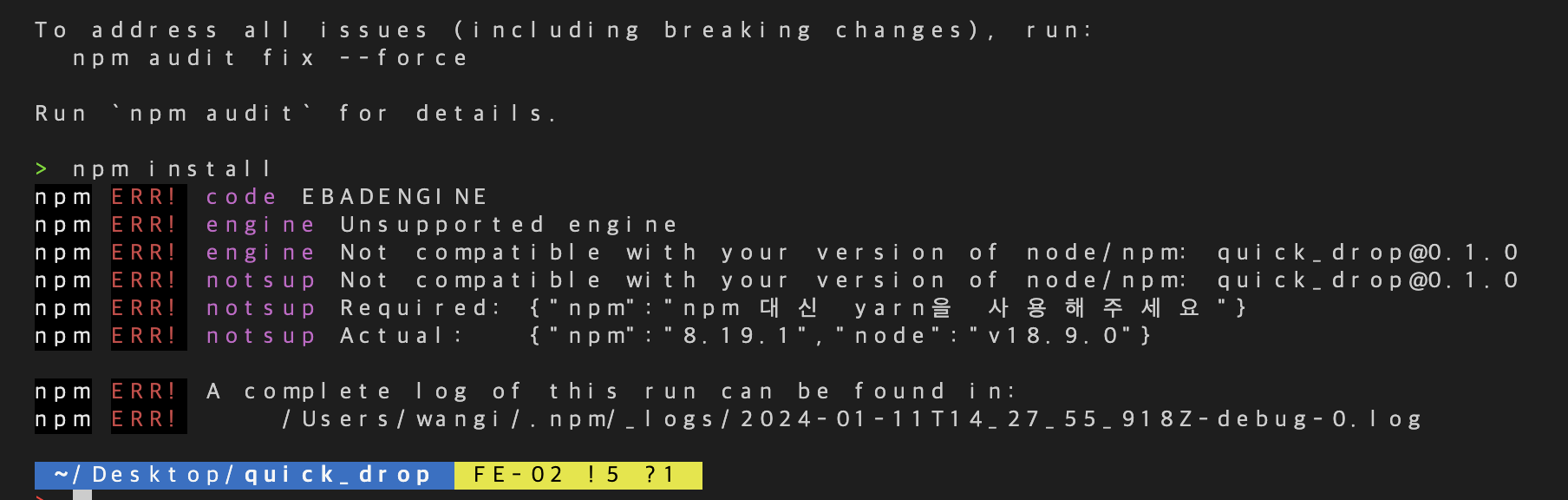 이렇게 npm 명령어를 사용하게 되면 에러를 뱉고, npm 대신 yarn을 사용하라는 텍스트를 터미널에서 확인할 수있다.