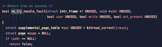 bool vm_try_handle_fault(struct intr_frame *f UNUSED, void *addr UNUSED,