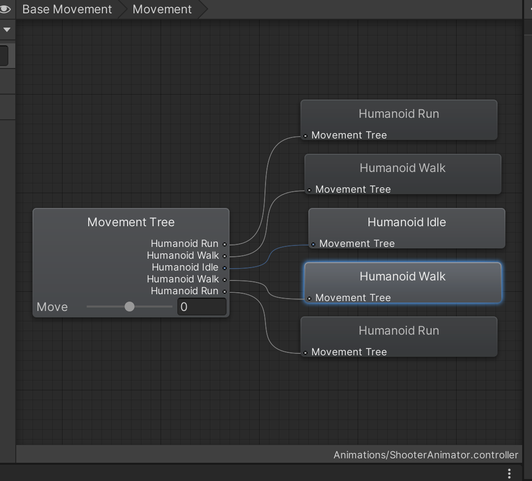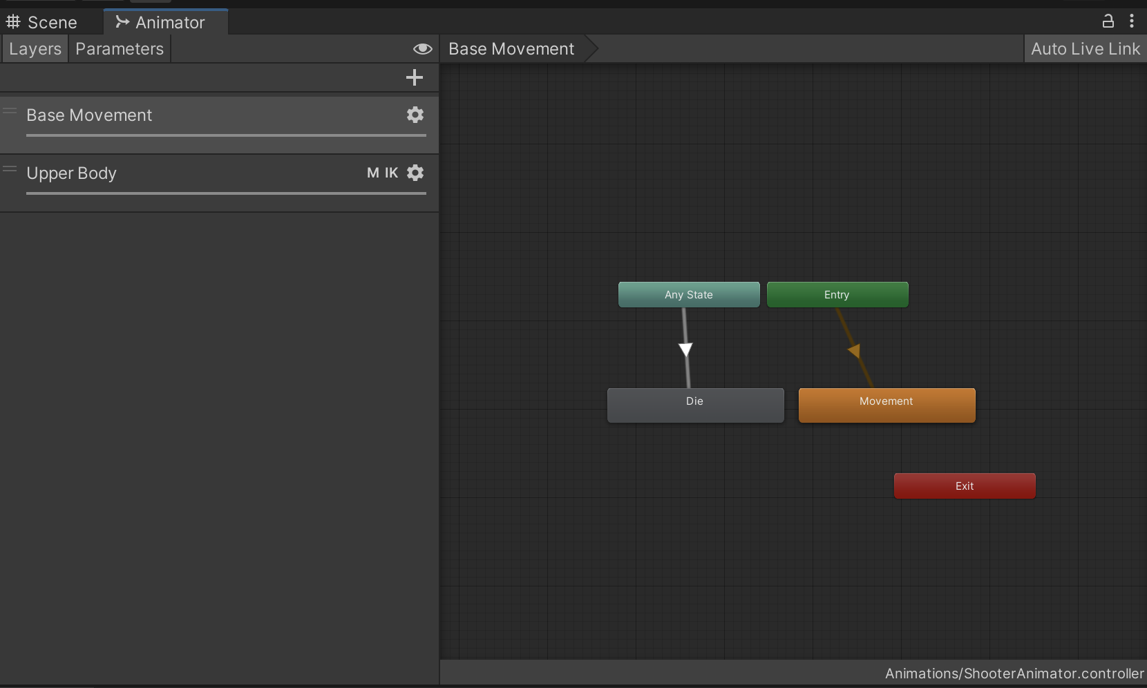 Base Movement 는 걷고 뛰는 기본 움직임, Upper Body 레이어는 상체에만 적용될 애니메이션 제공