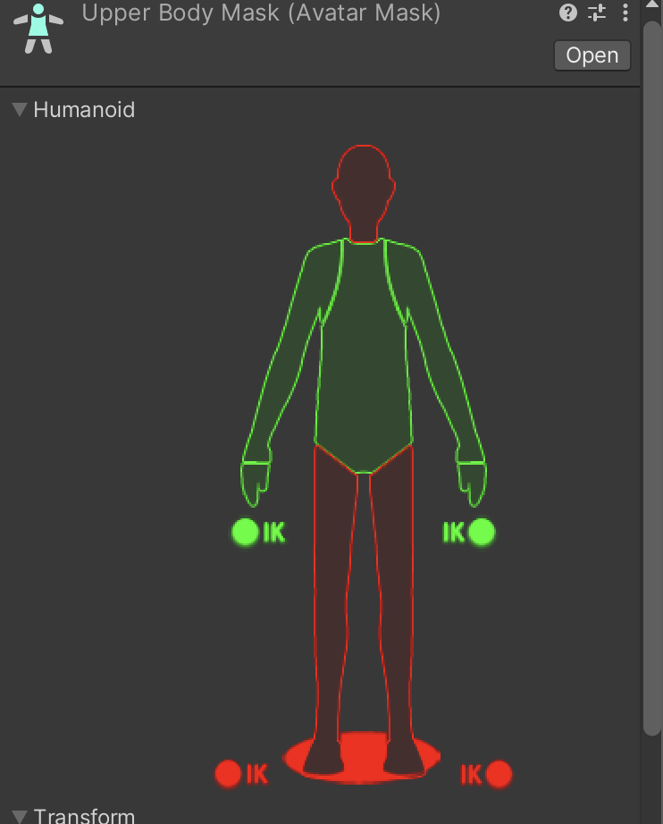 애니메이터의 레이어별로 부위를 다르게 적용하려면 아바타 마스크를 설정 필요
