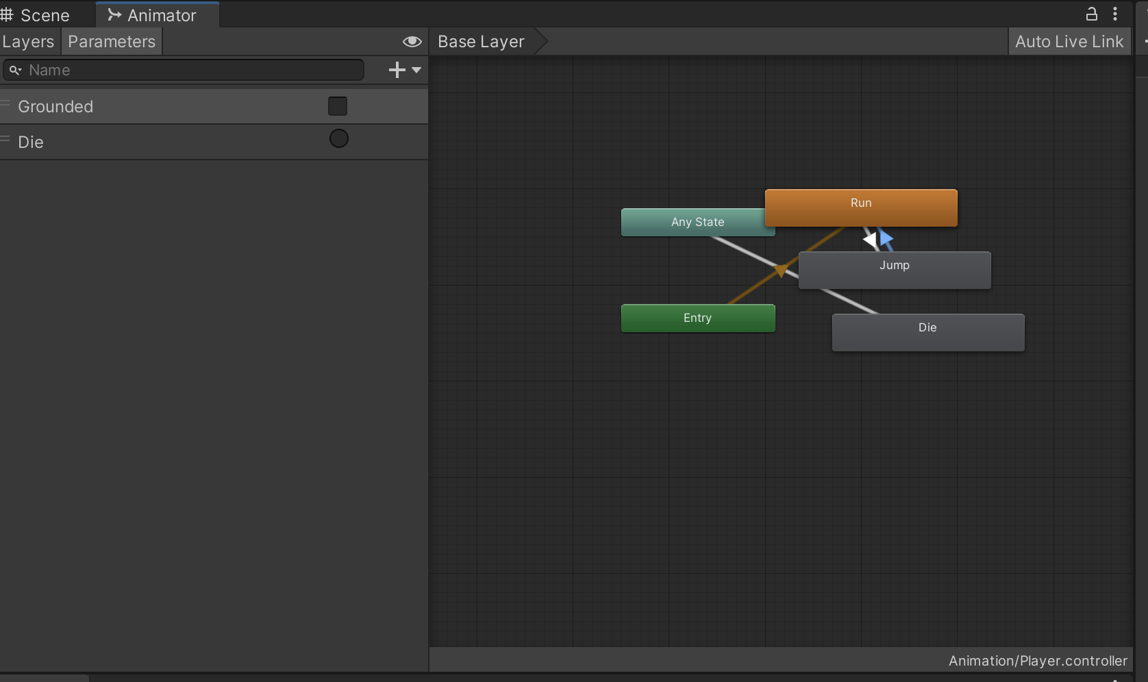 애니메이터 컨트롤러에서 화살표를 통해 간단히 전이 표현 가능