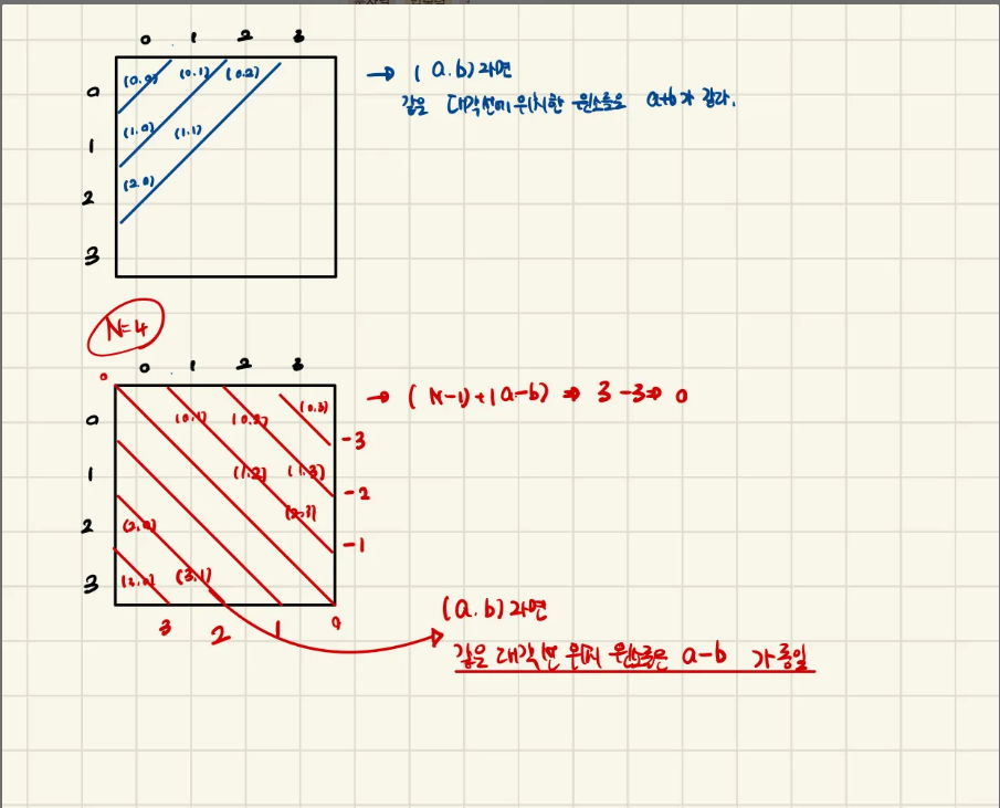 같은 행, 열은 어떻게 잘 이해했는데 같은 대각선에 있는 퀸을 판정하는 부분이 이해가 안가서
