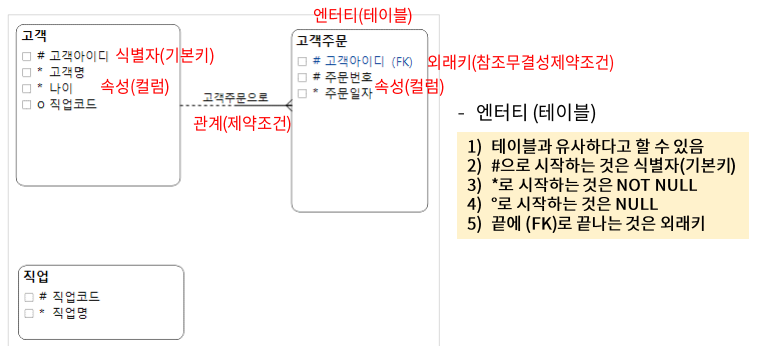 - 각 Entity는 식별자(기본키)를 가지고, 속성을 갖고 있다.