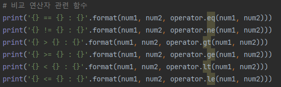 , >=, <, <=, ==, != ( 단순 숫자 비교 )