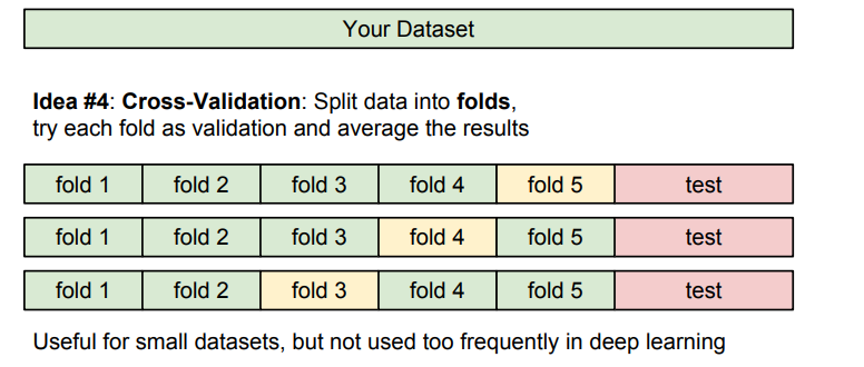그림에서도 볼 수 있듯이, train셋, test셋 사이에 동일하게 검증셋을 껴넣고, fold하는 방식을 사용합니다.