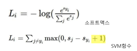 두 손실함수의 차이에 대해 고민을 하게 되었는데, SVM함수는 뒤에 '+1'이라는 마진 값이 있어서, 변화에 크게 민감하지 않고,