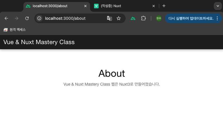 위와 같이 about.vue 파일을 생성하면, localhost:3000/about으로 접근 시 about.vue 파일이 app.vue의 NuxtPage 컴포넌트 위치에 렌더링됩니다.