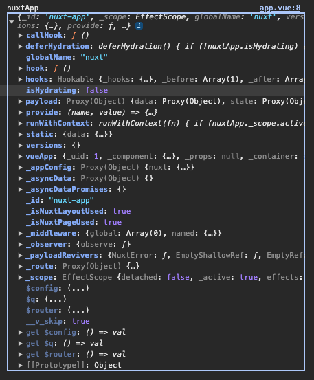 useNuxtApp 내장 composable 함수를 이용하면 런타임 앱 컨텍스트에 액세스할 수 있습니다.