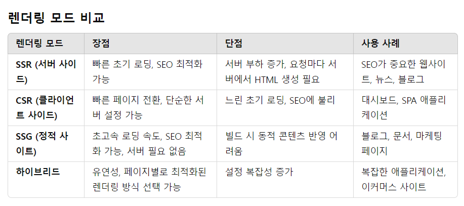 Nuxt 3에서 사용할 수 있는 렌더링 모드에는 서버 사이드 렌더링(SSR), 클라이언트 사이드 렌더링(CSR), 정적 사이트 생성(SSG) 등의 방식이 있습니다. 렌더링 방식의 선택은 상황에 맞게 결정하면 되므로, 각 방식을 어떻게 사용하는지 알아보도록 하겠습니다.