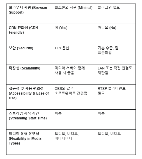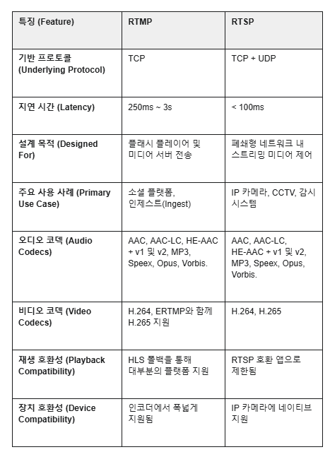 RTMP vs RTSP 사양 비교