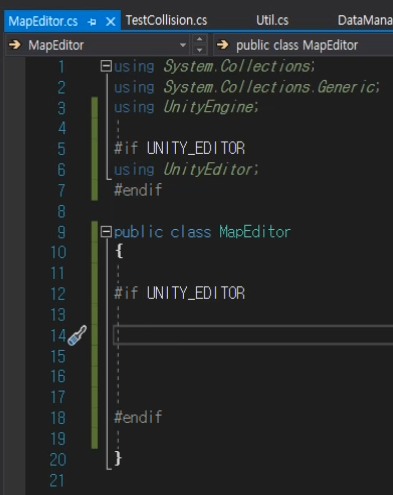 MapEditor에서 작성될 코드는 개발 중에만 컴파일되어야 하기 때문에 다음과 같이 UNITY_EDITOR로 감싸준다.