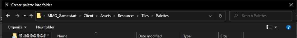 Tile Palette 윈도우를 열고 Palette_Map이라는 팔레트를 만들어주는데 아래 경로로 설정을 하면 그 경로에 같은 이름의 프리팹이 생성된 것을 볼 수 있다.