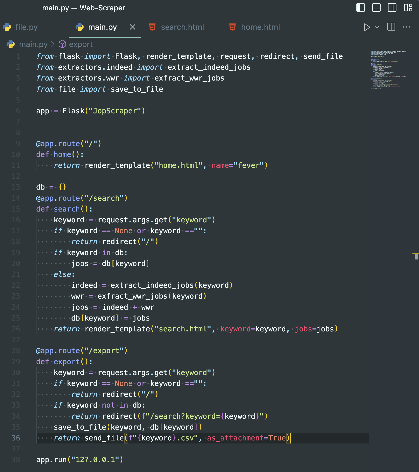 - 이후 save_to_file에 있는 keyword.csv를 export 하기 위해 send_file를 임포트한다.