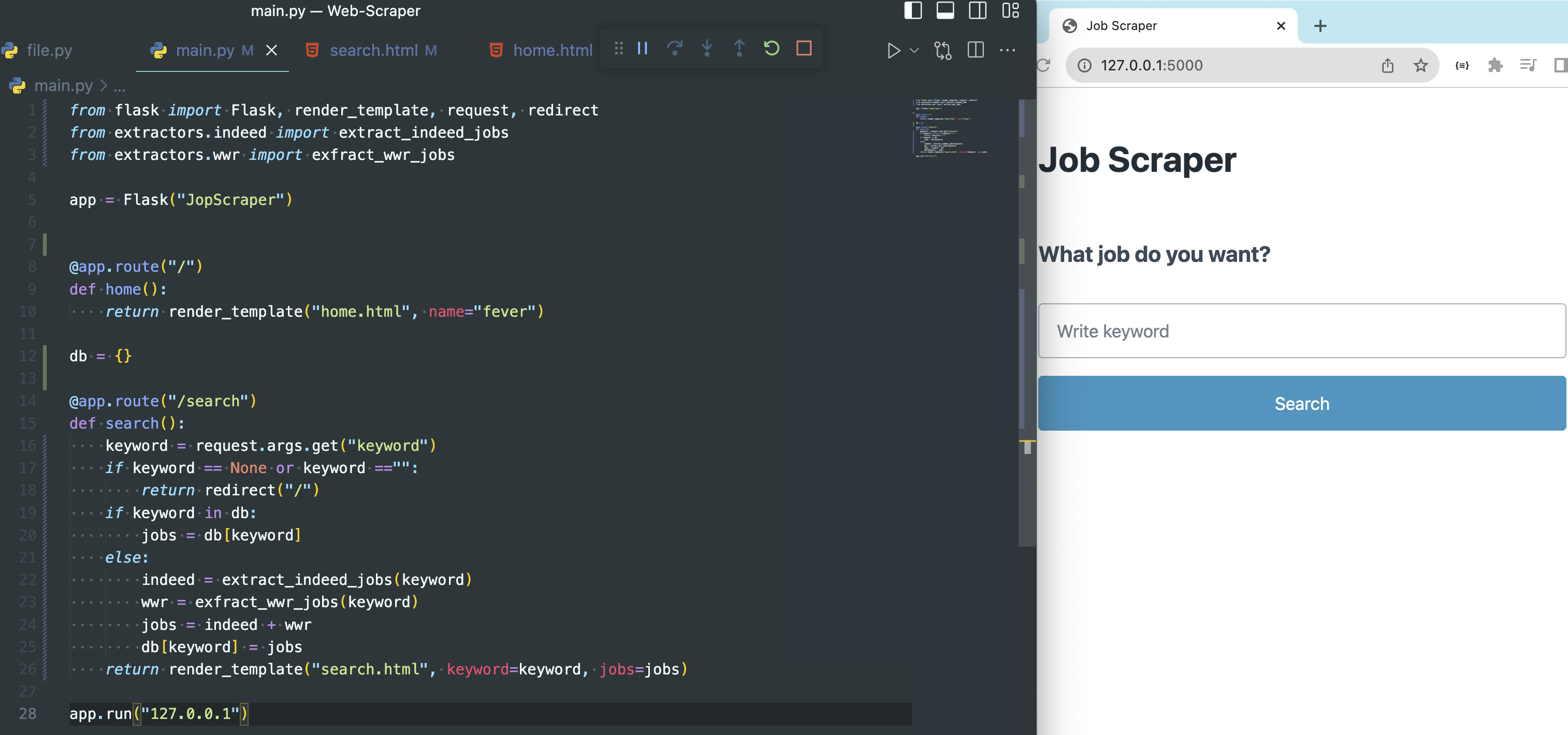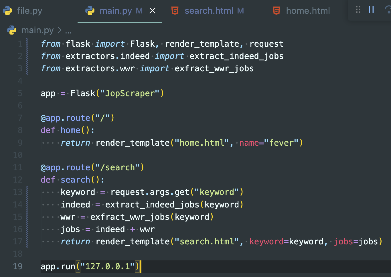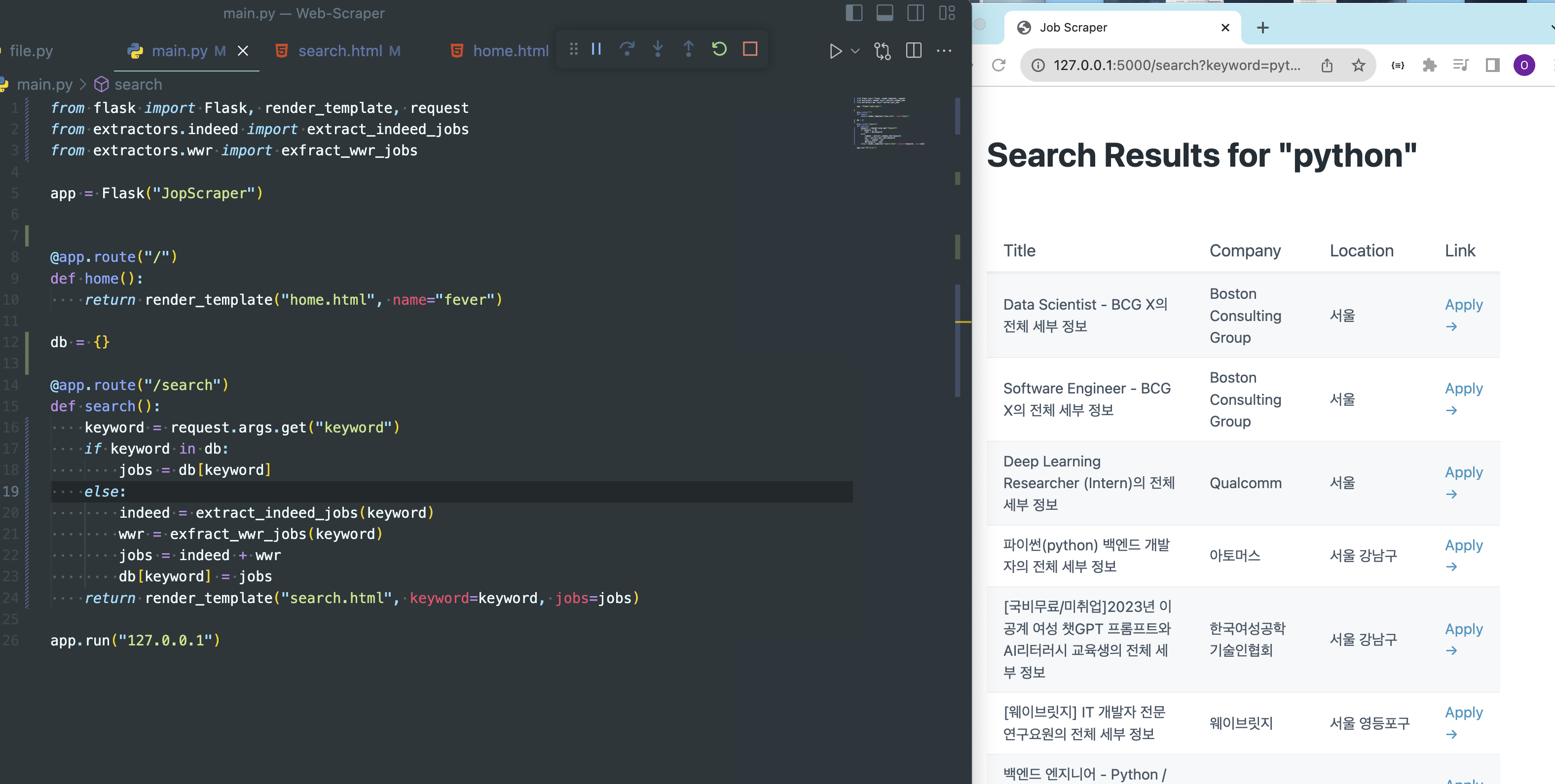 - 기존 방식과 동일하게 indeed, wwr변수를 만들어서 실행함수에 키워드를 전달한다.