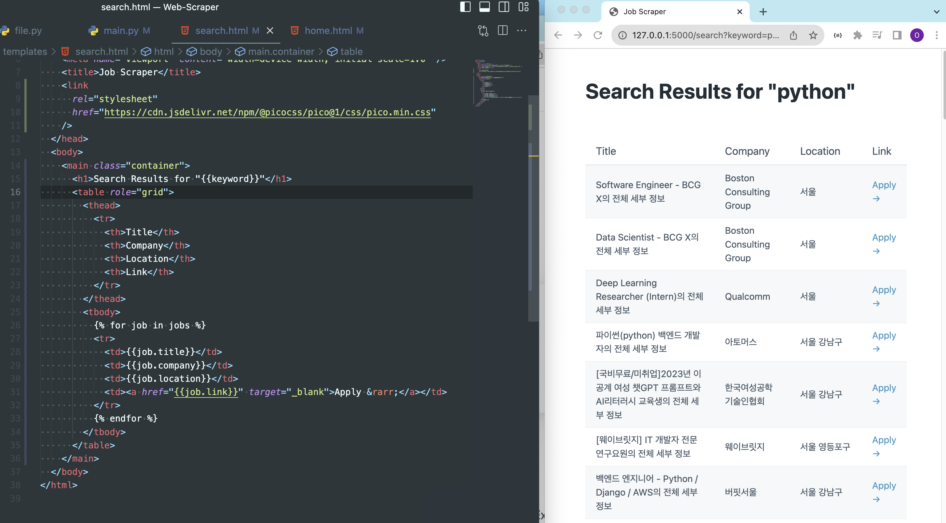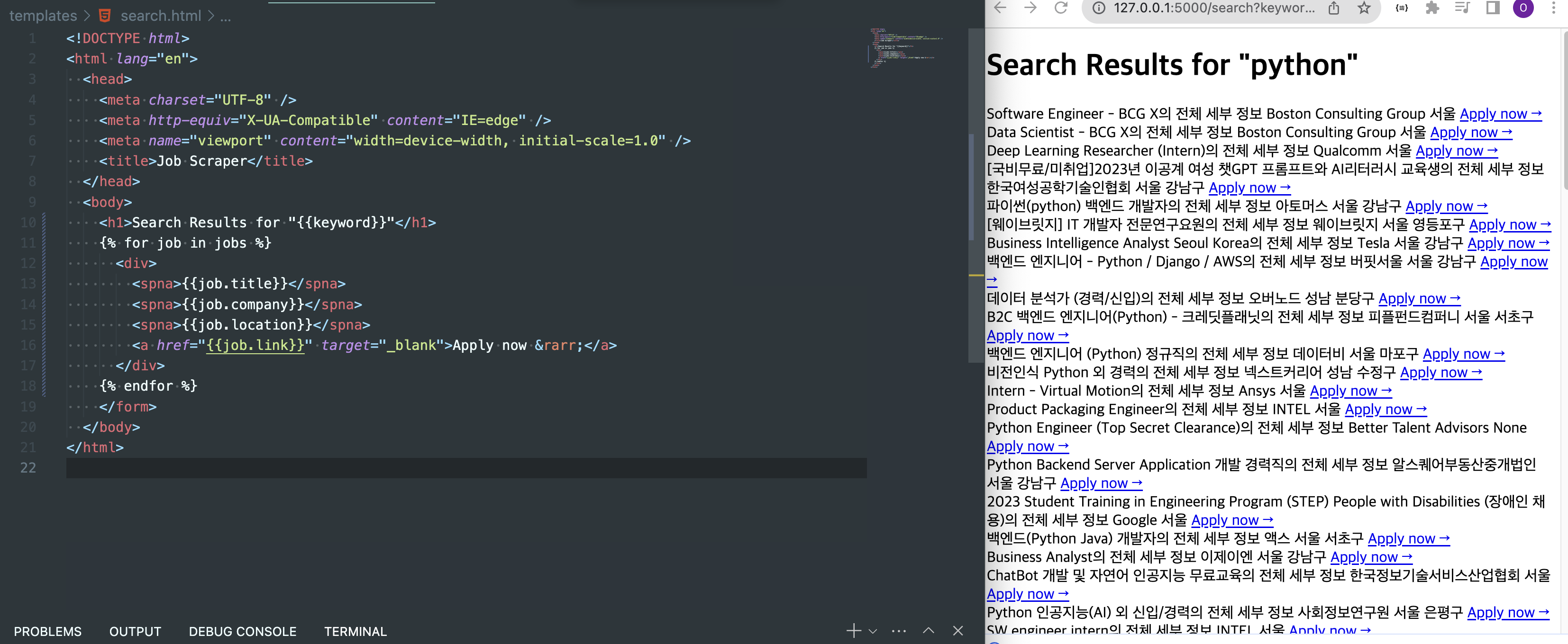 - 이후 search.html에 jobs의 값을 전달한다.